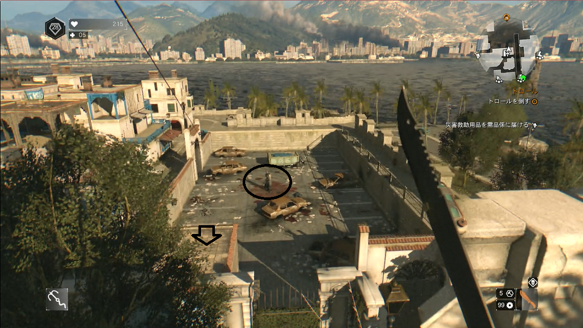 すぐ近くの広場にいるグーンを矢印のところから投擲武器や火炎瓶で倒す。